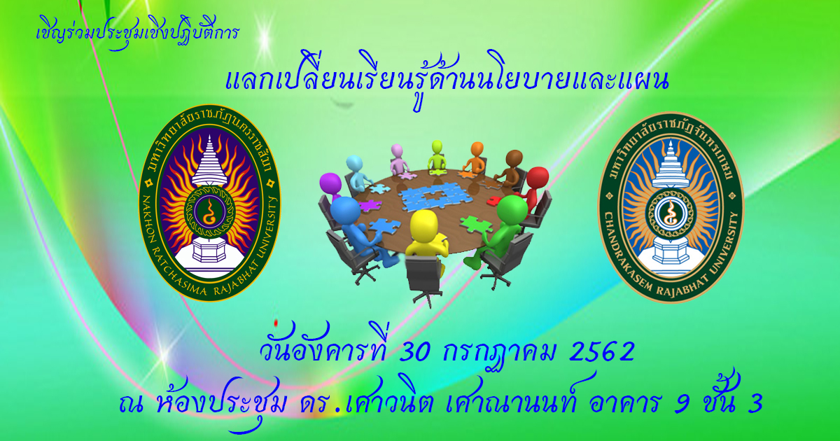 กองนโยบายและแผน เชิญร่วมประชุมเชิงปฏิบัติการ และแลกเปลี่ยนเรียนรู้ด้านนโยบายและแผนของมหาวิทยาลัยราชภัฏนครราชสีมา และมหาวิทยาลัยราชภัฏจันทรเกษม วันอังคารที่ 30 กรกฏาคม 2562 ณ ห้องประชุม ดร.เศาวนิต เศาณานนท์ อาคาร 9 ชัั้น 3